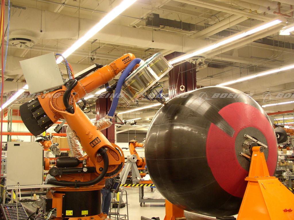 A robot places composite fibers on the tank’s inner wall structure. Engineers at Boeing Research & Technology formed the composite cryogenic tank using automated fiber placement at the Boeing Developmental Center in Tukwila, Wash. This tank recently completed pressure tests at the Marshall Center. In the past, propellant tanks have been fabricated out of metals. The almost 8-foot-diameter (2.4 meter) composite tank tested at the Hydrogen Cold Flow Test Facility at NASA's Marshall Space Flight Center in Huntsville, Ala. is considered game changing because composite tanks may significantly reduce the cost and weight for launch vehicles and other space missions.