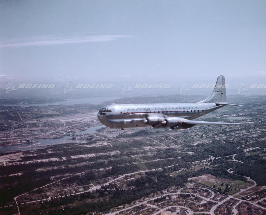 The 377 Stratocruiser was the last of the Boeing propeller-powered luxury airliners. Known as the “First Lady of the Airways,” it first flew in 1947 as the elegant, civilian offspring of the C-97, a military freighter that carried soldiers and equipment during World War II. A circular stairway led from the cabin to a lower deck luxury lounge. As a sleeper, it held 28 upper- and lower-bunk units. The first Stratocruiser began service in 1949 between San Francisco to Honolulu. Only five years later, the Boeing “Dash 80” prototype for the Model 707 made its first flight, and the Stratocruiser became obsolete. It found a new career as special transport for large sections of spacecraft. With its fuselage swollen by a superstructure, the once-elegant Stratocruiser became known as the “Pregnant Guppy” and, even larger, as the “Super Guppy.”