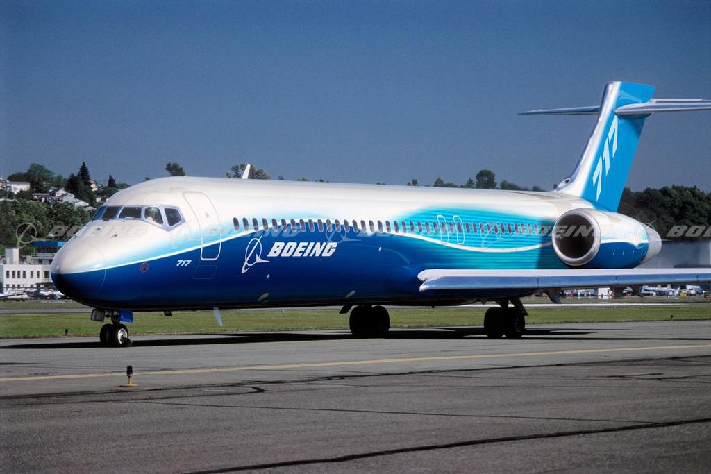 This 717 is pictured in the majestic shades of blue and white inspired by the Earth and sky that highlight the new look Boeing is adopting as its Commercial Airplanes brand colors. The new Boeing livery draws its inspiration from the Boeing “Horizon” ad campaign, with a paint scheme that flows along the fuselage in lines reminiscent of the earthÆs gently curved horizon. The colors û whites, fresh blues and aqua û are suggestive of the colors of our planet as it appears from space. The new livery is unique from other paint designs in that there are only two hard lines on the airplaneÆs design û the top and bottom of the “horizon” line. All other colors in the livery blend seamlessly across the fuselage and wings. Boeing painters used an automotive painting technique called “fading” to attain this effect.
