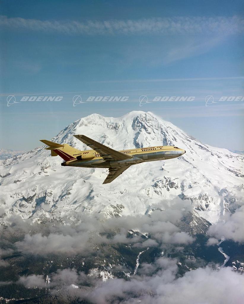 The short-to-medium-range 727 jet, which first flew in 1963, was the only Boeing-built trijet in its time. It was designed to operate out of small airports with shorter runways. The 131-passenger trijet also was the first Boeing commercial jetliner to use an auxiliary power unit (APU). The 727 jet also was built as a freighter and as a “quick change” version, which airlines could convert from a passenger transport to a freighter, or a combination of both, as they chose.
