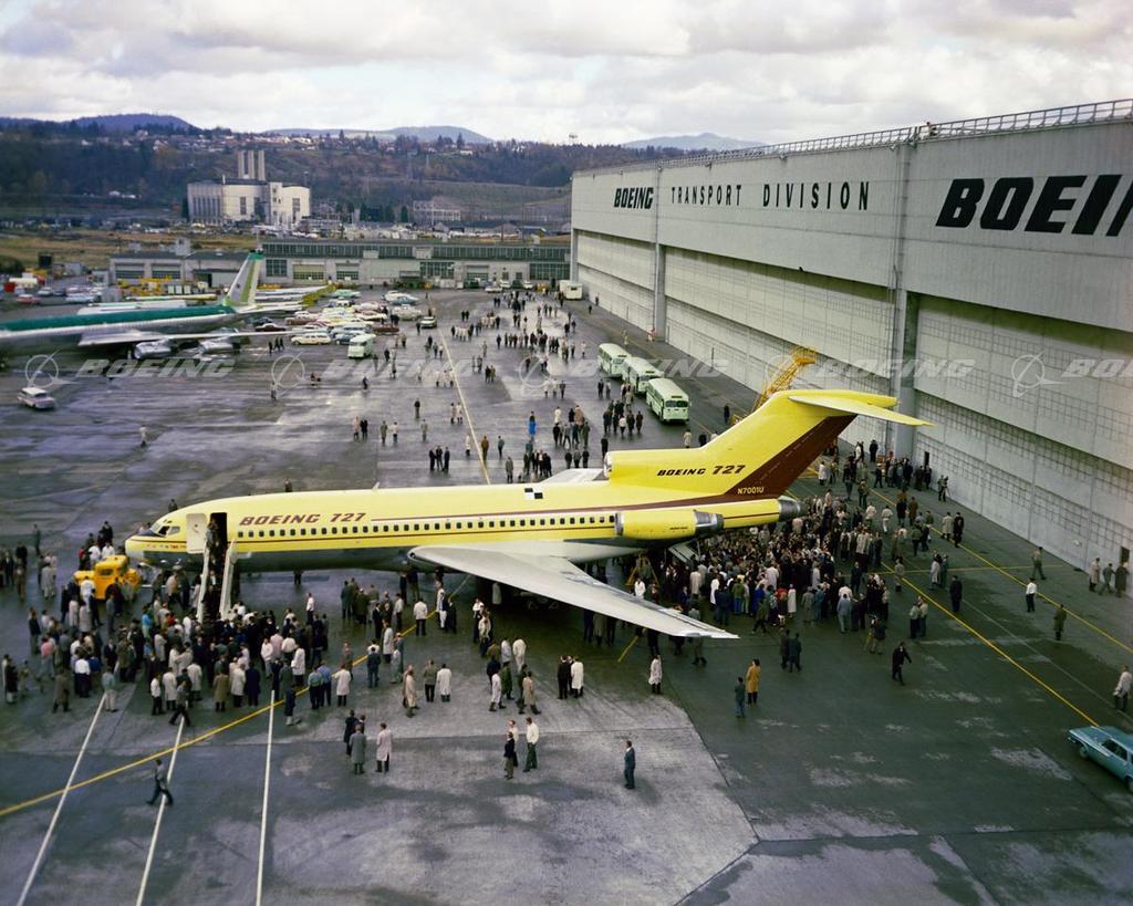 The first 727 rolled out Nov. 27, 1962, bearing the same lemon-yellow and copper-brown color scheme as the Dash 80. Originally, Boeing planned to build 250 of the planes. However, after being shown to the world, they proved so popular (especially after the larger 727-200 model, which carried up to 189 passengers, was introduced) that a total of 1,832 were produced at the Renton, WA plant. Variants included a convertible passenger-cargo model with a Quick Change (QC) option -- seats and galleys attached to removable pallets.