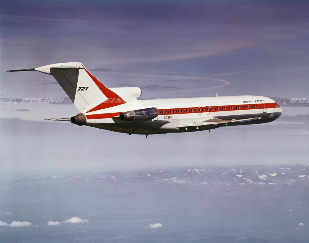 The short-to-medium-range 727 jet, which first flew in 1963, was the only Boeing-built trijet in its time. It was designed to operate out of small airports with shorter runways. The 131-passenger trijet also was the first Boeing commercial jetliner to use an auxiliary power unit (APU). The 727 jet also was built as a freighter and as a “quick change” version, which airlines could convert from a passenger transport to a freighter, or a combination of both, as they chose.