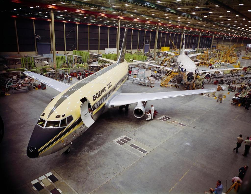 The best-selling Boeing 737 started as a smaller, short-range jet. Models 737-300, -400, and -500 were followed by the Next-Generation 737-600, -700, -800, -900, and the luxurious Boeing Business Jet. The Boeing Next-Generation 737s are the most advanced single-aisle airplanes in the market today. While these new airplanes retain the characteristics that made 737 classics so popular worldwide - reliable, simple and economical to operate - they underwent dramatic revisions. In 2002 the 737 manufacturing process converted to a moving line system, replacing the station to station method of assembly pictured here.