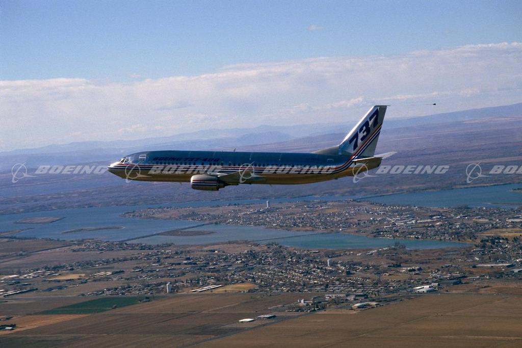Development of the quieter, more fuel-efficient CFM56-3 series of engines allowed Boeing to improve its most popular jetliners and produce the advanced-technology 737-330, -400, and -500. The engines are larger and mounted forward of the wing struts instead of tucked directly under the wing as in the -100 and -200 versions. Advancements on the new-generation 737s included a stregthened wing to accomodate greater gross weight, tip extensions to the wings and horizontal stabilizers, and stregthened wheels, tires and brakes. The 737-200, -300, -400, -500 have the same handling characteristics so that pilots can use the same Type rating to fly all of them. Airlines' spares inventory and maintenance are simplified by making a substantial number of replaceable parts on the -300, -400, -500 identical to those used on the -200. The 737-400 is about 10 feet longer than the 737-300. It holds 19 more passengers and has a gross weight of up to 150,000 pounds, while retaining the same fuel efficiency, low noise, and low operating costs as its predecessor.