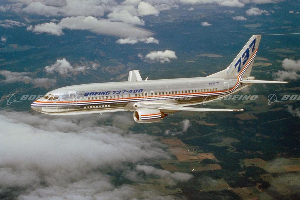 Development of the quieter, more fuel-efficient CFM56-3 series of engines allowed Boeing to improve its most popular jetliners and produce the advanced-technology 737-330, -400, and -500. The engines are larger and mounted forward of the wing struts instead of tucked directly under the wing as in the -100 and -200 versions. Advancements on the new-generation 737s included a stregthened wing to accomodate greater gross weight, tip extensions to the wings and horizontal stabilizers, and stregthened wheels, tires and brakes. The 737-200, -300, -400, -500 have the same handling characteristics so that pilots can use the same Type rating to fly all of them. Airlines' spares inventory and maintenance are simplified by making a substantial number of replaceable parts on the -300, -400, -500 identical to those used on the -200. The 737-400 is about 10 feet longer than the 737-300. It holds 19 more passengers and has a gross weight of up to 150,000 pounds, while retaining the same fuel efficiency, low noise, and low operating costs as its predecessor.