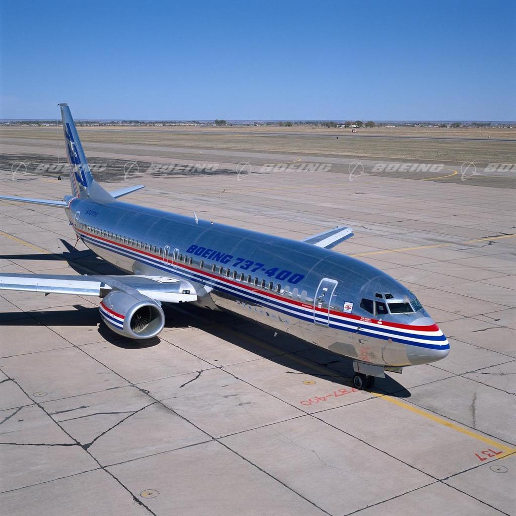 Development of the quieter, more fuel-efficient CFM56-3 series of engines allowed Boeing to improve its most popular jetliners and produce the advanced-technology 737-330, -400, and -500. The engines are larger and mounted forward of the wing struts instead of tucked directly under the wing as in the -100 and -200 versions. Advancements on the new-generation 737s included a stregthened wing to accomodate greater gross weight, tip extensions to the wings and horizontal stabilizers, and stregthened wheels, tires and brakes. The 737-200, -300, -400, -500 have the same handling characteristics so that pilots can use the same Type rating to fly all of them. Airlines' spares inventory and maintenance are simplified by making a substantial number of replaceable parts on the -300, -400, -500 identical to those used on the -200. The 737-400 is about 10 feet longer than the 737-300. It holds 19 more passengers and has a gross weight of up to 150,000 pounds, while retaining the same fuel efficiency, low noise, and low operating costs as its predecessor.