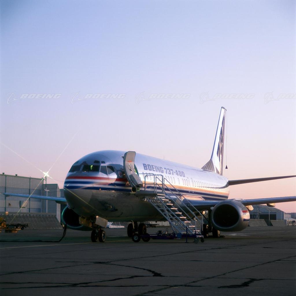 Development of the quieter, more fuel-efficient CFM56-3 series of engines allowed Boeing to improve its most popular jetliners and produce the advanced-technology 737-330, -400, and -500. The engines are larger and mounted forward of the wing struts instead of tucked directly under the wing as in the -100 and -200 versions. Advancements on the new-generation 737s included a stregthened wing to accomodate greater gross weight, tip extensions to the wings and horizontal stabilizers, and stregthened wheels, tires and brakes. The 737-200, -300, -400, -500 have the same handling characteristics so that pilots can use the same Type rating to fly all of them. Airlines' spares inventory and maintenance are simplified by making a substantial number of replaceable parts on the -300, -400, -500 identical to those used on the -200. The 737-400 is about 10 feet longer than the 737-300. It holds 19 more passengers and has a gross weight of up to 150,000 pounds, while retaining the same fuel efficiency, low noise, and low operating costs as its predecessor.