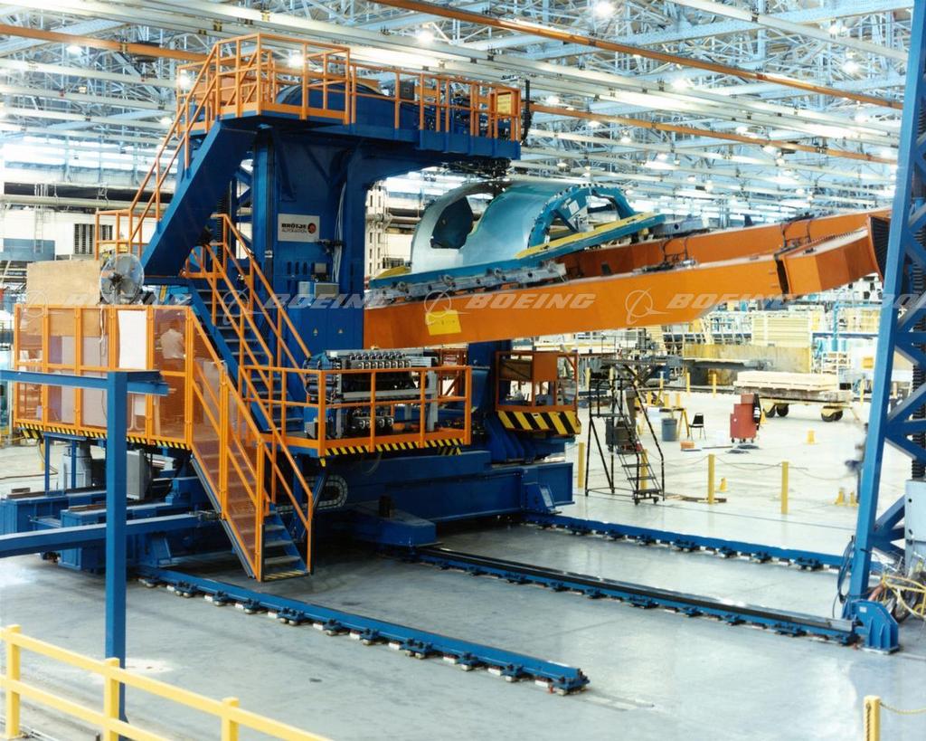 Worker Guiding 737-700 Wing Structure During Manufacturing