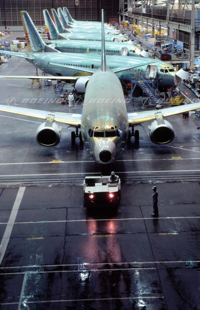 Production and rollout of 737s at Boeing's Renton, WA factory. In 2002 the 737 manufacturing process converted to a moving line system, replacing the station to station method of assembly pictured here.