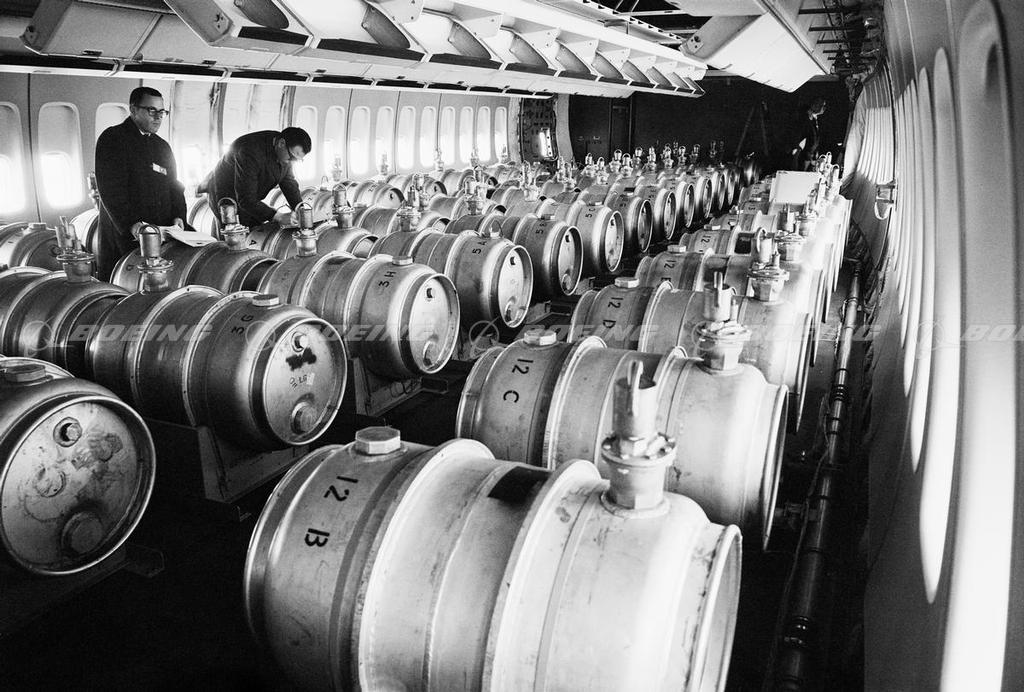 During flight testing of a new airplane model, barrels filled with water serve as a ballast system to test the center of gravity on the ground and during flight. The barrels can be moved forward or aft to test the system.