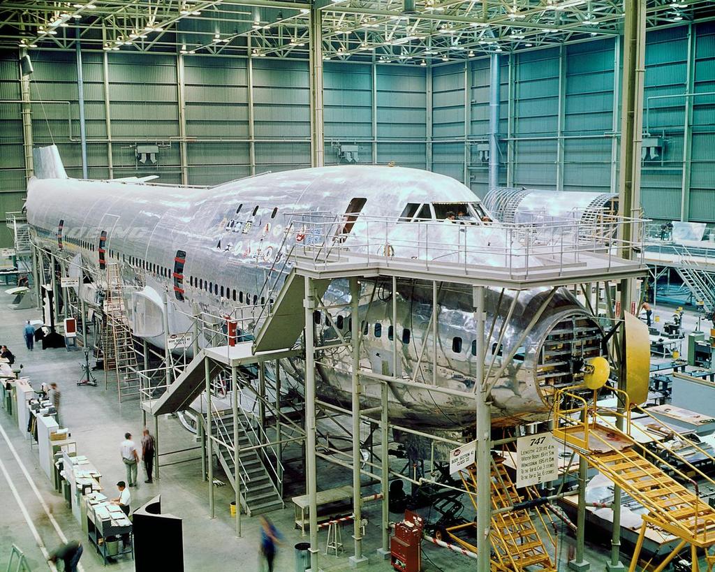 The 747 was truly monumental in size. The massive airplane required construction of the 200-million-cubic-foot 747 assembly plant in Everett, WA, the world's largest building (by volume). The fuselage of the original 747 was 225 feet long; the tail as tall as a six-story building. Pressurized, it carried a ton of air. The cargo hold had room for 3,400 pieces of baggage and could be unloaded in seven minutes. The total wing area was larger than a basketball court. Yet, the entire global navigation system weighed less than a modern laptop computer.