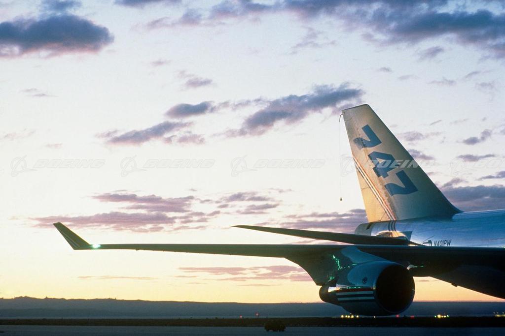 Silhouetted 747-400 Wingtip and Tail at Sunset