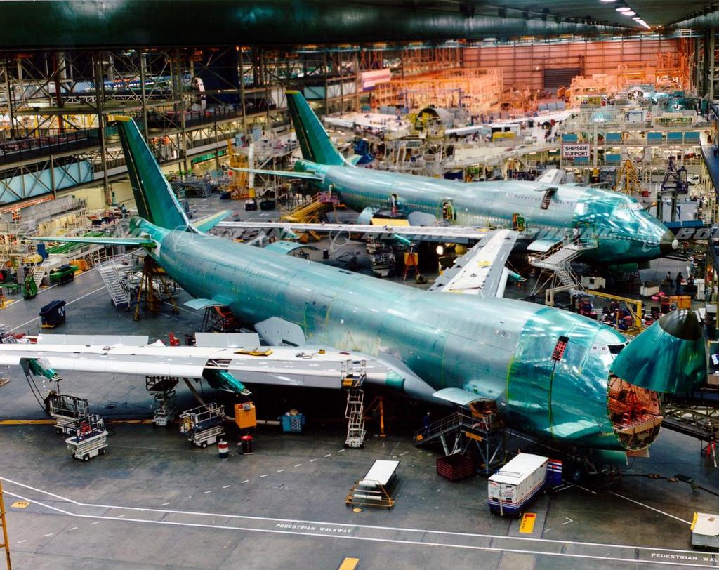 To build the world's largest jetliner in the 1960s, Boeing built the world's largest building. Construction began in 1966, and crews moved four times as much earth as was needed to complete the massive Grand Coulee Dam project on Washington's Columbia River. The original factory was completed in 1968. From its original size, it was expanded by more than 45 percent in 1980 to house the 767 assembly line, and another 50-percent enlargement was added in 1993 for 777 assembly. Each of the factory doors are roughly twice the size of an American football field.