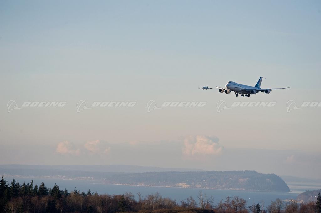 With 747 Chief Pilot Mark Feuerstein and Capt. Tom Imrich in the flight deck, the newest member of the 747 family took off at 12:39 p.m. local time from Paine Field in Everett and landed at Paine Field at 4:18 p.m.