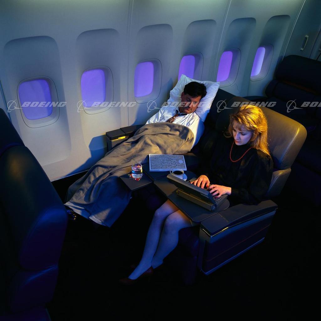 Passengers relax in comfort in the first class section of a Boeing 747 jetliner.