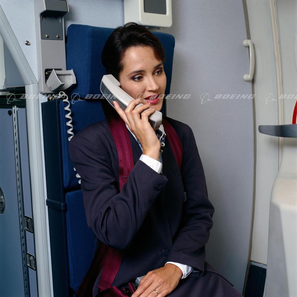 A flight attendent accesses the public address system from a jump seat in a 747-400.