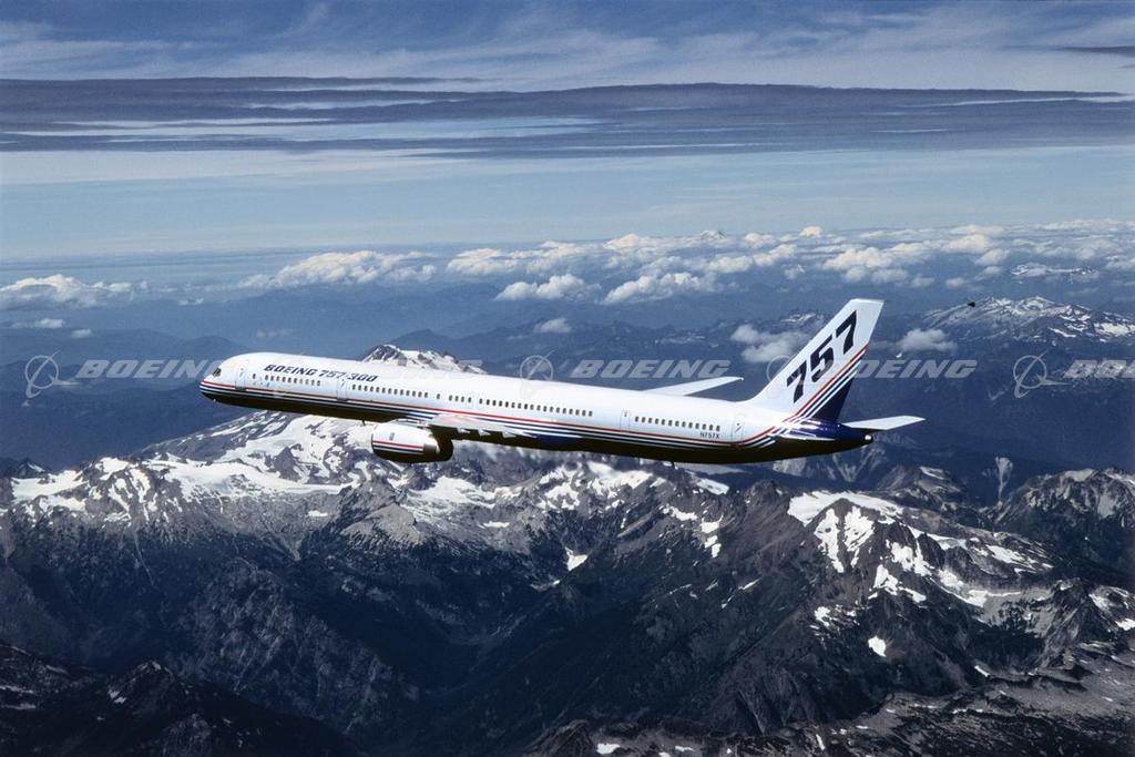 757-300 in Flight with Blue Sky and Snow-Covered Cascade Mountains