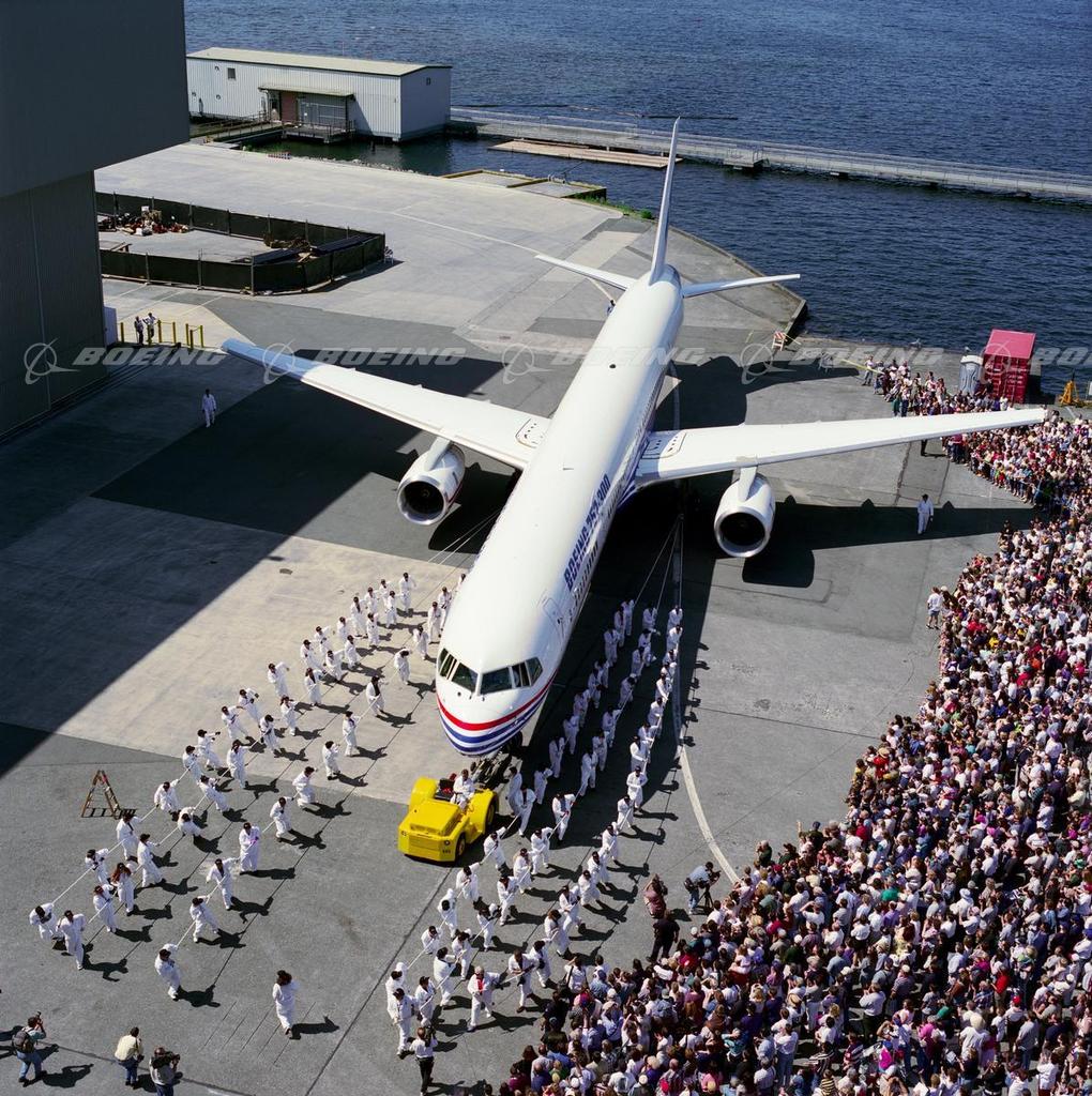 On May 31, 1998, The Boeing Company introduced the 757-300 at a rollout celebration at the company's Renton WA. manufacturing facility. Jumpsuit-clad employees from Boeing, its suppliers and customers pulled together to haul the first 757-300 into place at the ceremonial rollout.