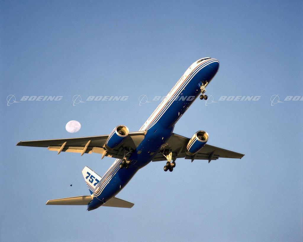 The twin-engine, medium-range Boeing 757 commercial transport first flew Feb. 19, 1982 and was up to 20 percent more fuel efficient than the 727s it was designed to replace. The 757-200, also offered as a freighter, can carry 239 passengers, in two classes, up to 4,520 miles. In September 1996, Boeing launched the 4,000-mile-range 757-300, a stretched model that seats from 243 to 279 passengers. In 18 years of operation, the 757 has carried more than 1.3 billion passengers, more than four times the population of the United States and Canada combined and has flown the equivalent of nearly 25,000 roundtrips between the Earth and the Moon.