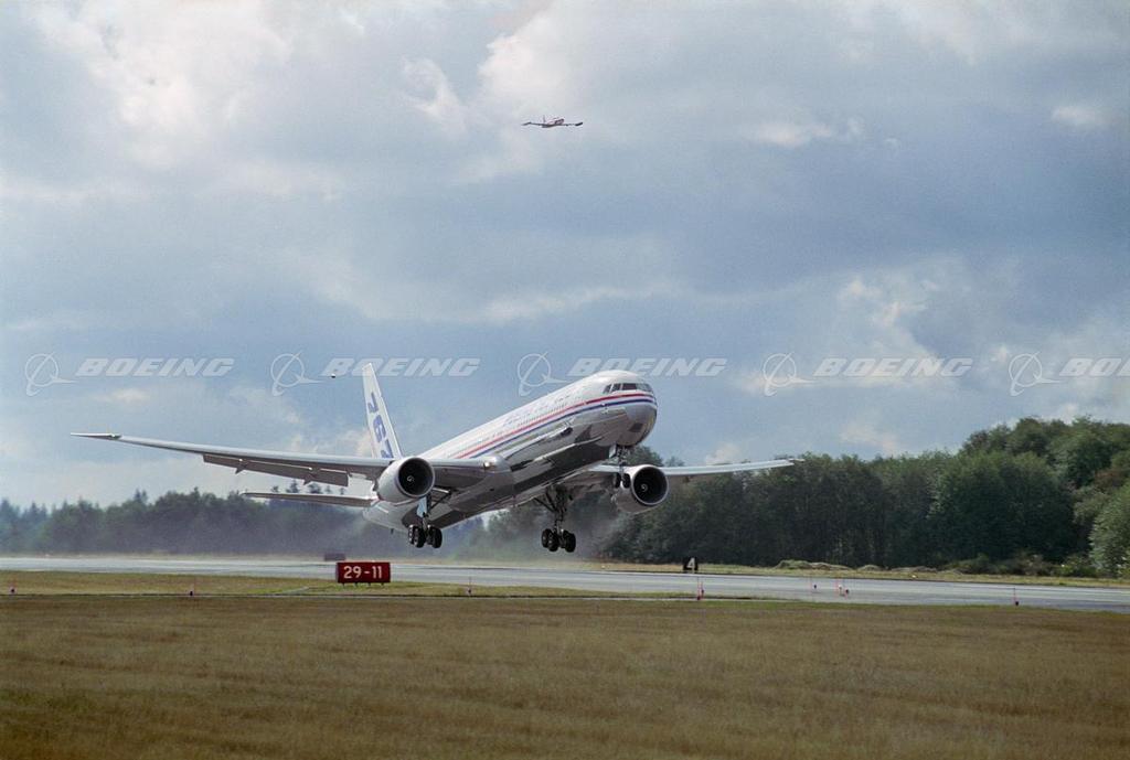 The 767-400ER (extended range) rose into the sky above Paine Field in Everett, Wash., on Oct. 9, 1999 for the first time, and headed west down the Strait of Juan de Fuca. The airplane, identified as VQ001, lifted off the runway at 12:10 p.m. During the flight a series of tests were conducted on the airplane's systems and structures. Flight-test equipment on board recorded and transmitted data to a flight-test control room at Boeing Field in Seattle. The debut flight signalled the official beginning of a six-and-a-half-month flight-test program for the 767-400ER, during which this airplane, and two other 767-400ERs accumulated approximately 800 flight hours and 1,100 ground-test hours. At the conclusion of flight tests, the 767-400ER achieved certification by the U.S. Federal Aviation Administration and concurrence by the European Joint Aviation Authorities.