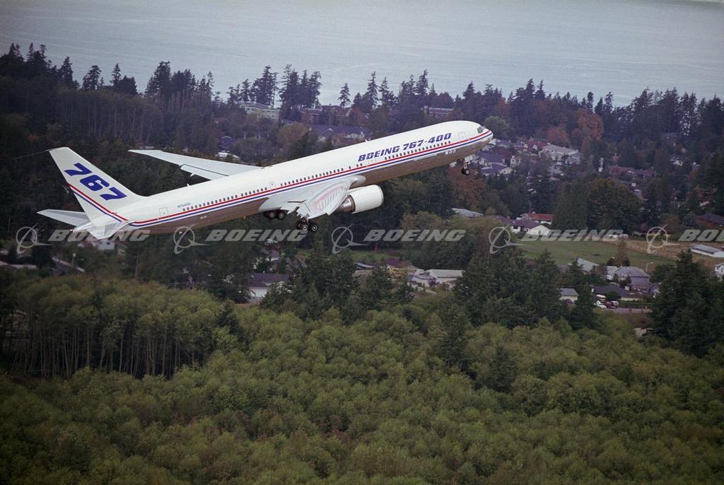 The 767-400ER (extended range) rose into the sky above Paine Field in Everett, Wash., on Oct. 9, 1999 for the first time, and headed west down the Strait of Juan de Fuca. The airplane, identified as VQ001, lifted off the runway at 12:10 p.m. During the flight a series of tests were conducted on the airplane's systems and structures. Flight-test equipment on board recorded and transmitted data to a flight-test control room at Boeing Field in Seattle. The debut flight signalled the official beginning of a six-and-a-half-month flight-test program for the 767-400ER, during which this airplane, and two other 767-400ERs accumulated approximately 800 flight hours and 1,100 ground-test hours. At the conclusion of flight tests, the 767-400ER achieved certification by the U.S. Federal Aviation Administration and concurrence by the European Joint Aviation Authorities.