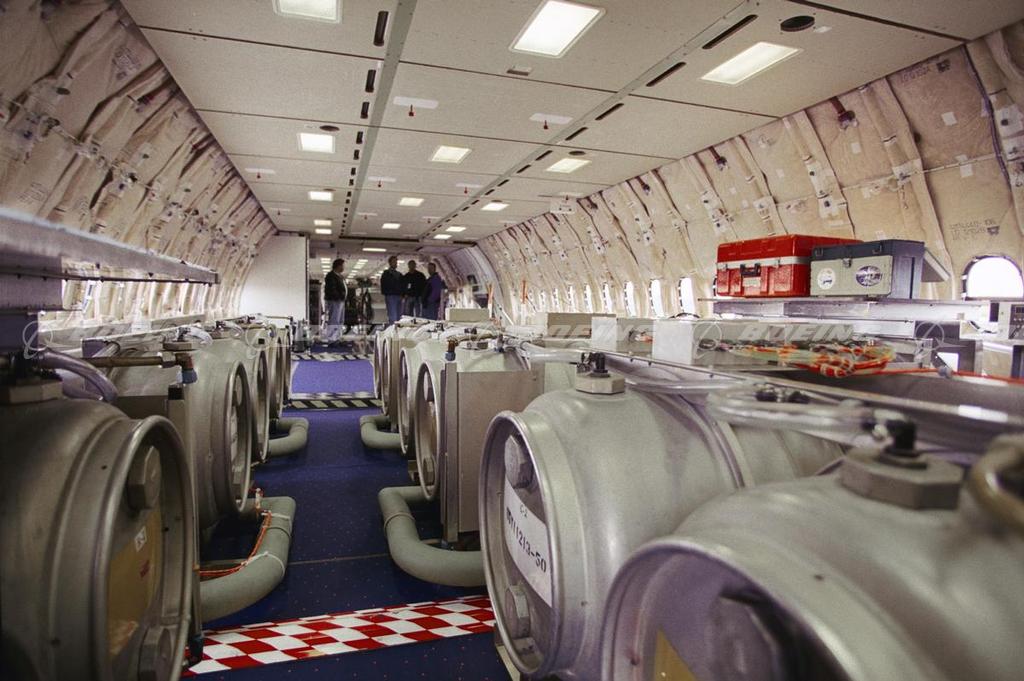 In place of passenger seats, carpets and stow bins, the first 767-400ER(extended range), designated VQ001, is furnished with 26,000 pounds of flight test equipment. The most noticeable fixtures are the 42 keg-shaped water barrels, used to simulate the weight of passengers and baggage. For certain tests, water is pumped between barrels to rapidly change the airplane's center of gravity. Instruments, installed on racks, can record more than 21,000 inputs during flight, including engine performance, temperatures and flight control surface angles, which are transmitted in real time to a telemetry, or transmission, room at Boeing Field in Seattle. The data allows engineering specialists to monitor and analyze the airplane's systems and performance. The goal of flight testing is to thoroughly test the airplane and ensure that it is reliable and service-ready when it is delivered to the launch customer.