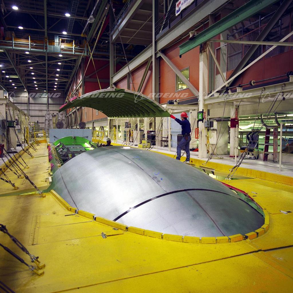 Resembling a sea creature rising to the water’s surface, the first 767-400ER in its tooling receives a crown section. Mechanics are now fastening the large panels to complete the airframe forward of the wing. The two airframe segments lined up precisely - the flight deck cab built in the Boeing facility in Wichita, Kan., and the forward passenger cabin built by Japan’s Kawasaki Heavy Industries. Boeing plans to join the entire airframe in June and roll the airplane out of the hangar in August. First flight is scheduled for October.