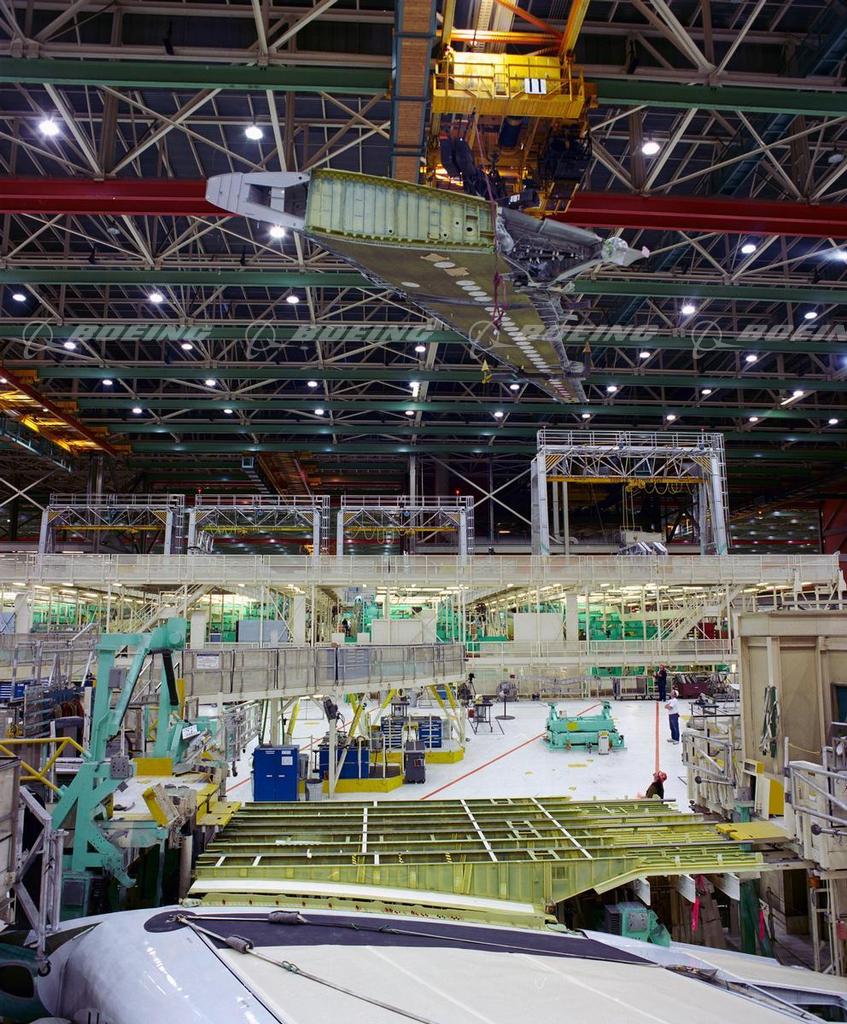 Production of the 767-400ER enters the final-body-join stage, when major parts are fastened to form the airplane.