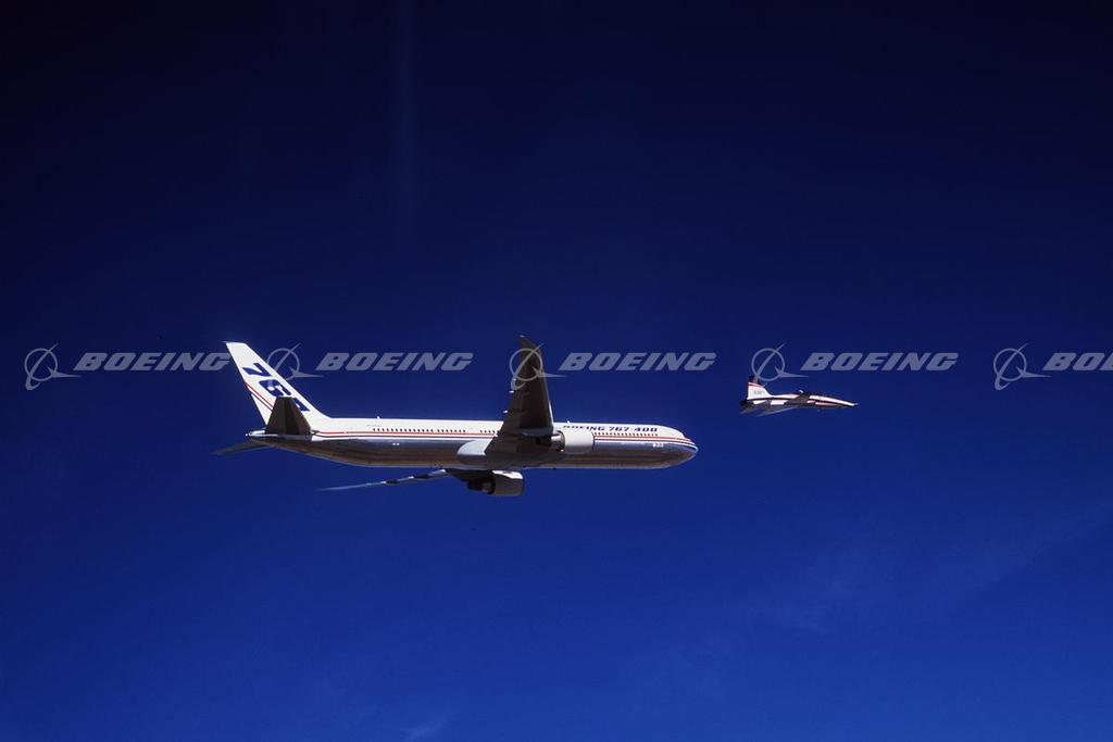 The 767-400ER (extended range) rose into the sky above Paine Field in Everett, Wash., on Oct. 9, 1999 for the first time, and headed west down the Strait of Juan de Fuca. The airplane, identified as VQ001, lifted off the runway at 12:10 p.m. During the flight a series of tests were conducted on the airplane's systems and structures. Flight-test equipment on board recorded and transmitted data to a flight-test control room at Boeing Field in Seattle. The debut flight signalled the official beginning of a six-and-a-half-month flight-test program for the 767-400ER, during which this airplane, and two other 767-400ERs accumulated approximately 800 flight hours and 1,100 ground-test hours. At the conclusion of flight tests, the 767-400ER achieved certification by the U.S. Federal Aviation Administration and concurrence by the European Joint Aviation Authorities.