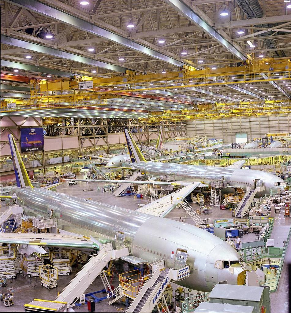The 777-200 longer-range jetliner can fly 8,860 nautical miles, making it the longest range airplane in the world. It can connect cities as far apart as Singapore and New York or Atlanta and Hong Kong. The 777 wing uses the most aerodynamically efficient airfoil ever developed for subsonic commercial aviation. This advanced wing enhances the airplane's ability to climb quickly and cruise at higher altitudes than competing airplanes while achieving higher cruise speeds. It also allows the airplane to carry full passenger payloads out of many high-elevation, high-temperature airfields. In November 2006, the 777 manufacturing process converted to a moving line system, replacing the old station to station method of assembly pictured here.