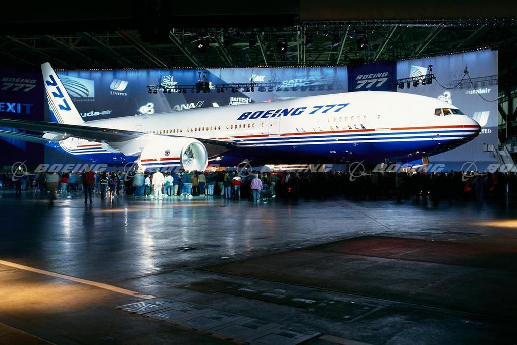 Ceremonial rollout of the first 777. Boeing unveiled the first 777 to approximately 100,000 employees and their guests, customers and suppliers.