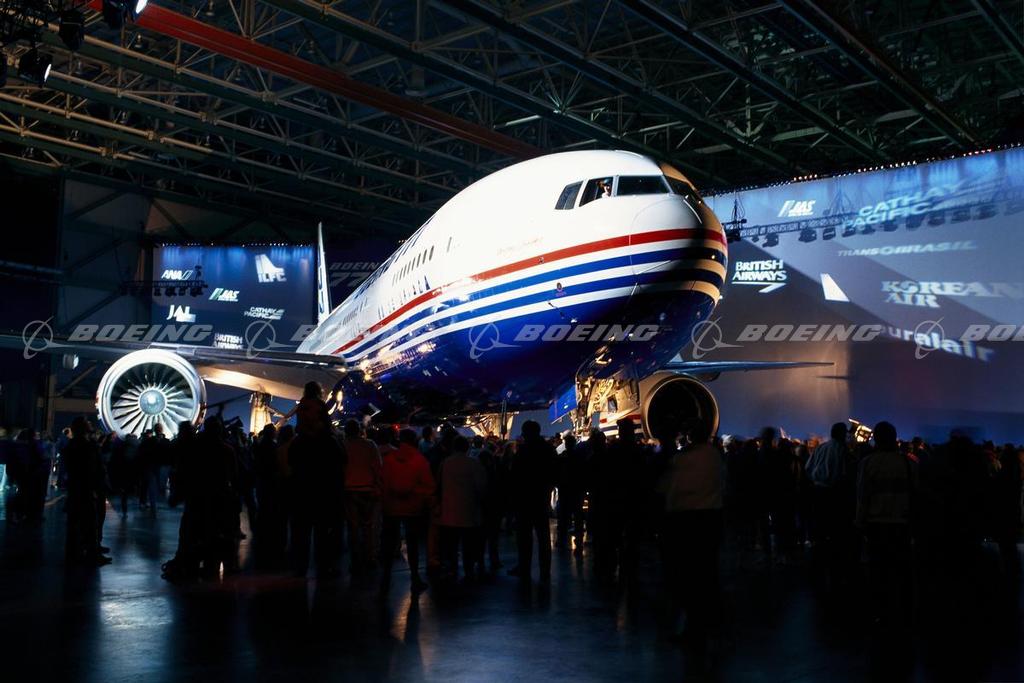 Ceremonial rollout of the first 777. Boeing unveiled the first 777 to approximately 100,000 employees and their guests, customers and suppliers.