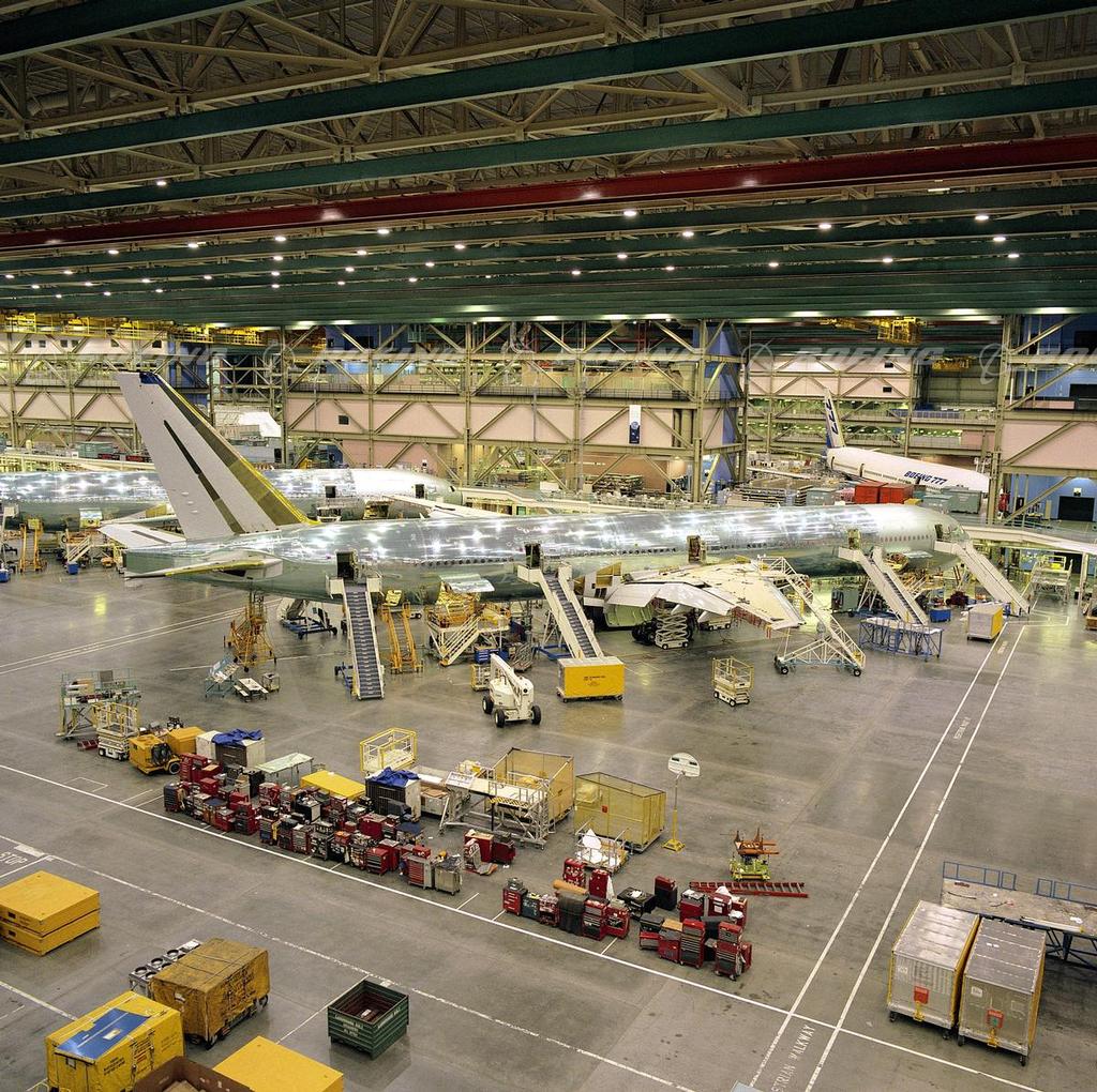 On regional and domestic routes, the 777-300 offers similar seating capacity and comfort with much better fuel and crew efficiency than early generation 747s. The 777 wing uses the most aerodynamically efficient airfoil ever developed for subsonic commercial aviation. This advanced wing enhances the airplane's ability to climb quickly and cruise at higher altitudes than competing airplanes while achieving higher cruise speeds. It also allows the airplane to carry full passenger payloads out of many high-elevation, high-temperature airfields. In November 2006, the 777 manufacturing process converted to a moving line system, replacing the old station to station method of assembly pictured here.