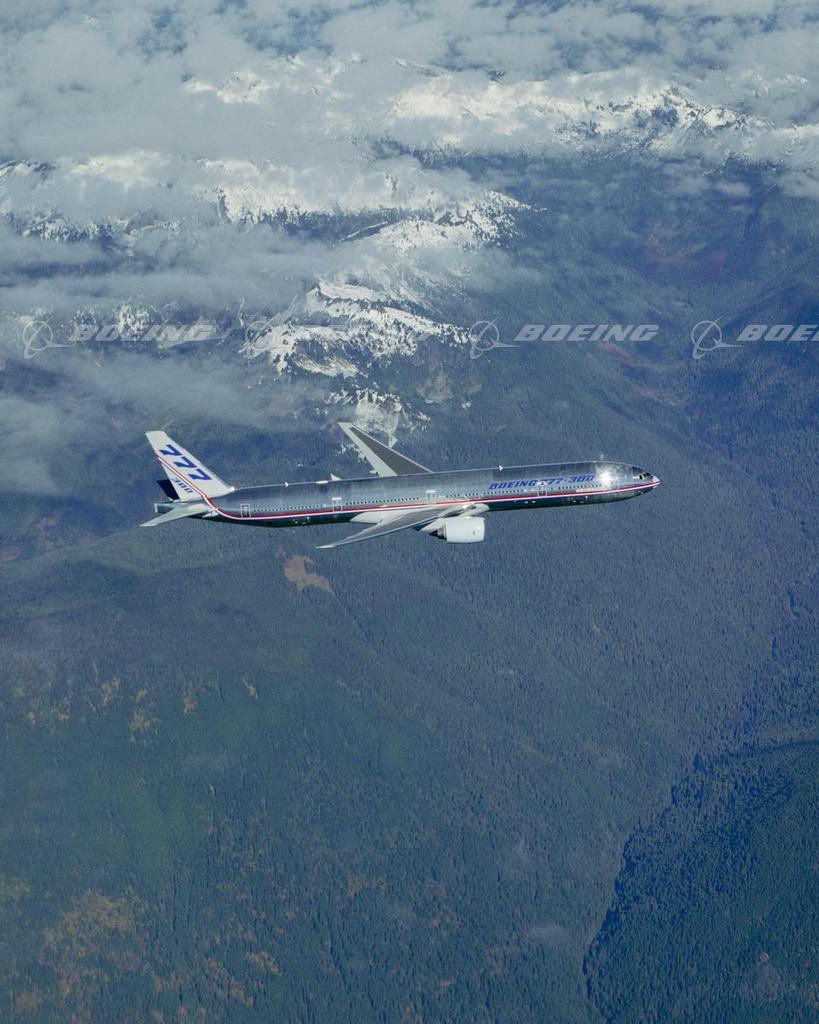 777-300 in flight over Puget Sound. On regional and domestic routes, the 777-300 offers similar seating capacity and comfort with much better fuel and crew efficiency than early generation 747s. The 777 wing uses the most aerodynamically efficient airfoil ever developed for subsonic commercial aviation. This advanced wing enhances the airplane's ability to climb quickly and cruise at higher altitudes than competing airplanes while achieving higher cruise speeds. It also allows the airplane to carry full passenger payloads out of many high-elevation, high-temperature airfields.