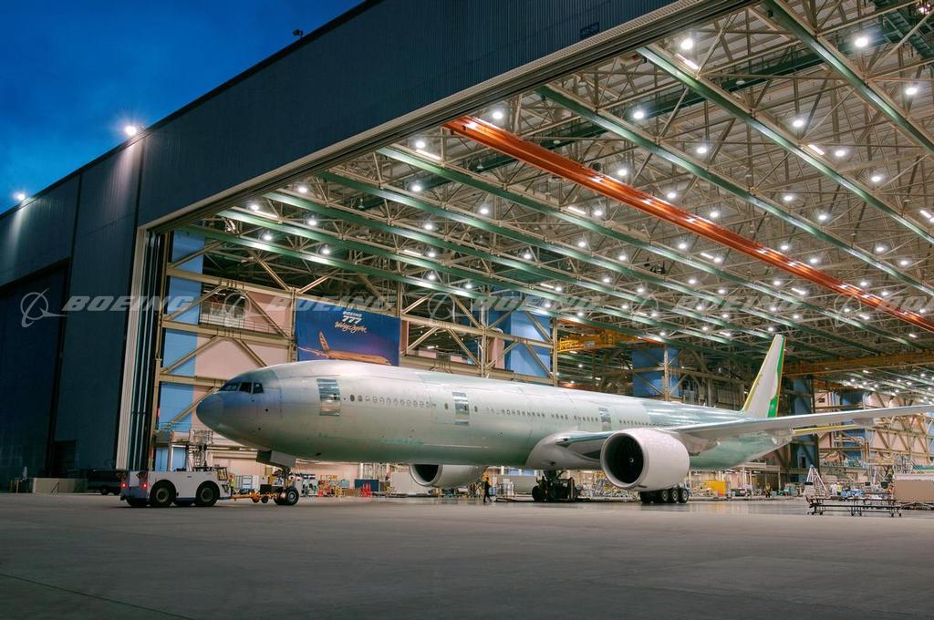 Fully assembled, the 777-300ER (extended range) airplane rolls to the next stage in the manufacturing process – into paint at the factory in Everett, WA. Approximately 35 percent of the 777-300ER’s design is different than earlier 777 models’. One noticeable difference is the airplane’s use of larger and more powerful engines. The airplane is powered by the GE90-115B.