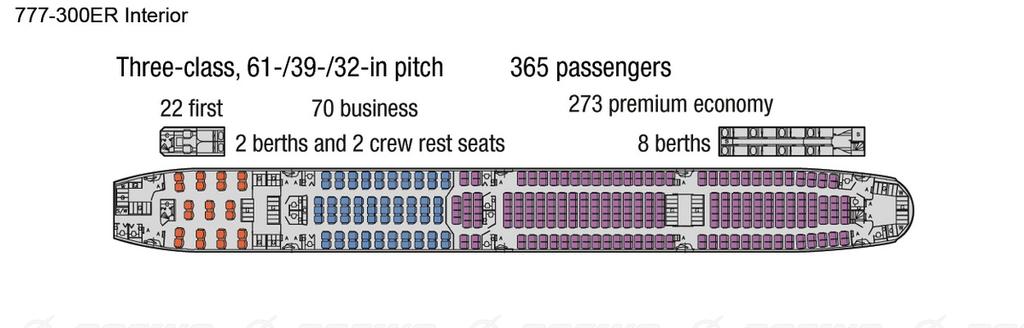 The 777-300ER extends the 777 family's span of capabilities, bringing twin-engine efficiency and reliability to the long-range market. The airplane carries 365 passengers up to 7,930 nautical miles (14,685 kilometers).