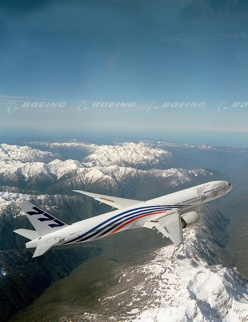 The first Boeing 777-300ER (extended range) airplane sported a creative paint scheme of a world map on both sides of the forward section. Displayed on the map were major city pairs reachable with the 777-300ER.