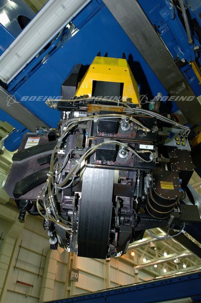 A robotic head assembly on an automatic tape lay-up machine at the Boeing composites manufacturing facility in Frederickson, Washington. Carbon fiber tape loaded for automatic tape lay-up is visible in this view.
