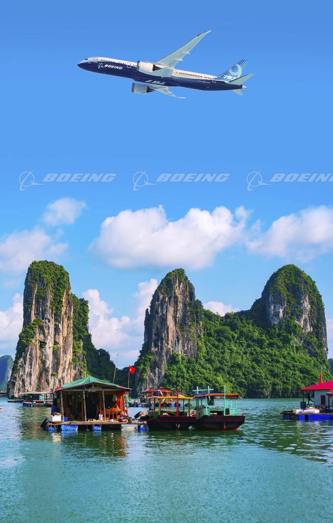 787-9 Dreamliner flies above Ha Long Bay in Vietnam