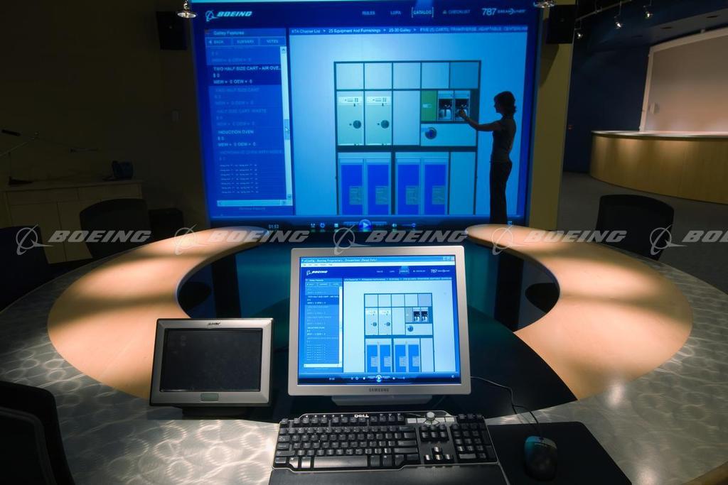 A full-height, backlit screen in the galley showroom at the 787 Dreamliner Gallery allows 787 customers to view their galley configuration virtually to test ergonomics and get a complete understanding of the galley layout they select. The Dreamliner Gallery is a showroom in Everett, WA that supports the 787's standardization effort by providing airline customers one place to go to see all of the offerings in the 787 catalog as they configure their airplanes.