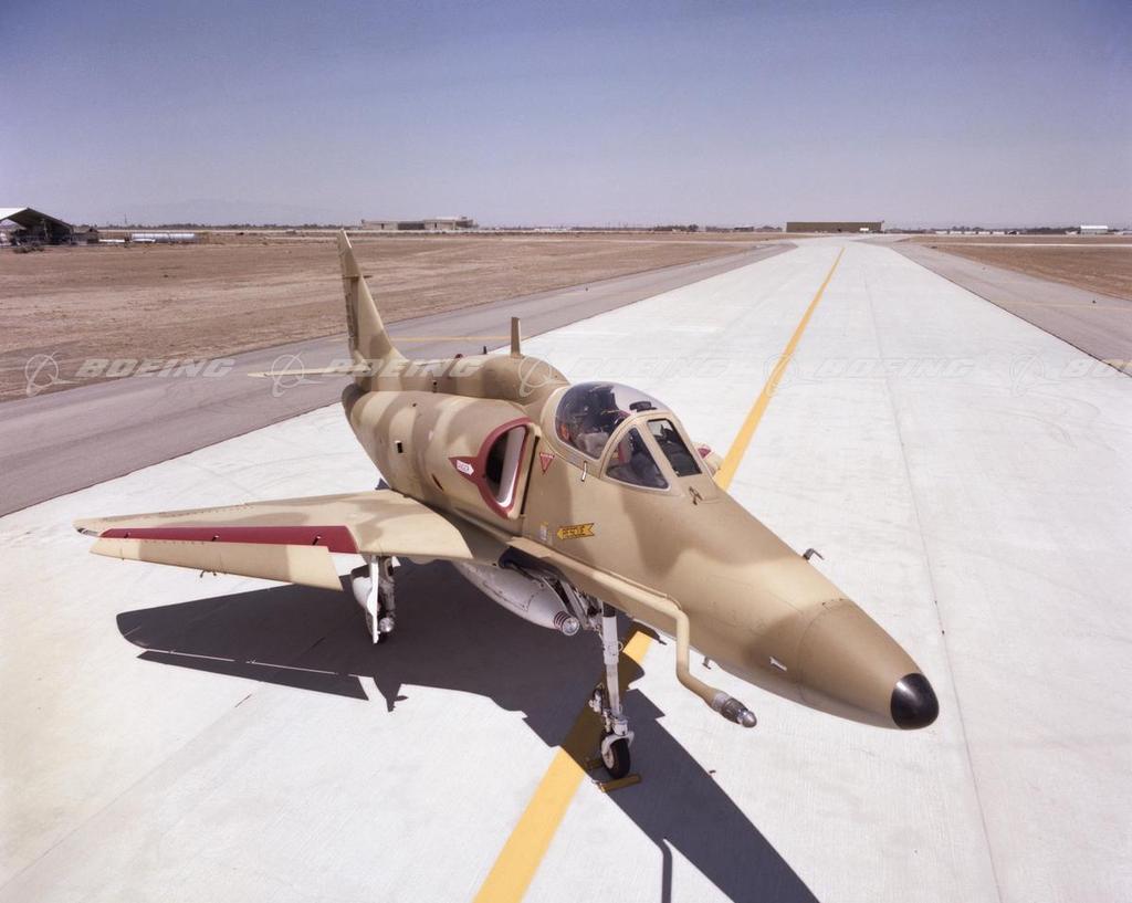 Douglas A-4 Skyhawk (1954-1979): Another successful attack aircraft from the Ed Heinemann team at Douglas was the A-4 Skyhawk. Designed for carrier operations, the Skyhawk was America’s smallest combat jet. Known as “Heinemann’s Hot Rod,” “Scooter,” and the “Mighty Midget,” it reversed the trend toward bigger and more complex aircraft in favor of durability and reliability. The A-4D first flew on June 22, 1954, demonstrating combinations of high performance and lightweight, with speed and maneuverability never before seen in an attack jet. After 1962, the joint service designation was changed to A-4. Behind the AD Skyraider, the A-4 Skyhawk was the most numerous postwar combat aircraft built by Douglas. During its long service career, the U.S. Navy and Marine Corps and the air arms of six other nations flew the A-4 The Skyhawk saw combat in Vietnam, the Middle East, the Falkland Islands, and the Persian Gulf. For 12 years, from 1974 to 1986, the A-4 Skyhawk served with the Navy’s Blue Angels flight demonstration team. In 1979, twenty-five years after its first flight, the last of 2,960 A-4s was delivered. Two-seat trainer versions included the TA-4F, TA-4J and the TA-4K Series. In addition to its primary role as a jet trainer, the TA-4 retained the A-4’s combat capabilities with bombs, rockets, missiles and guns. The TA-4 series had a slightly longer fuselage but carried less internal fuel than the A-4 attack bomber series. The first of the A-4 jet trainer series was delivered to the U.S. Navy in February 1966. A total of 555 TA-4 jet trainers were built. An additional 23 TA-4s were modified from A-4 airframes.