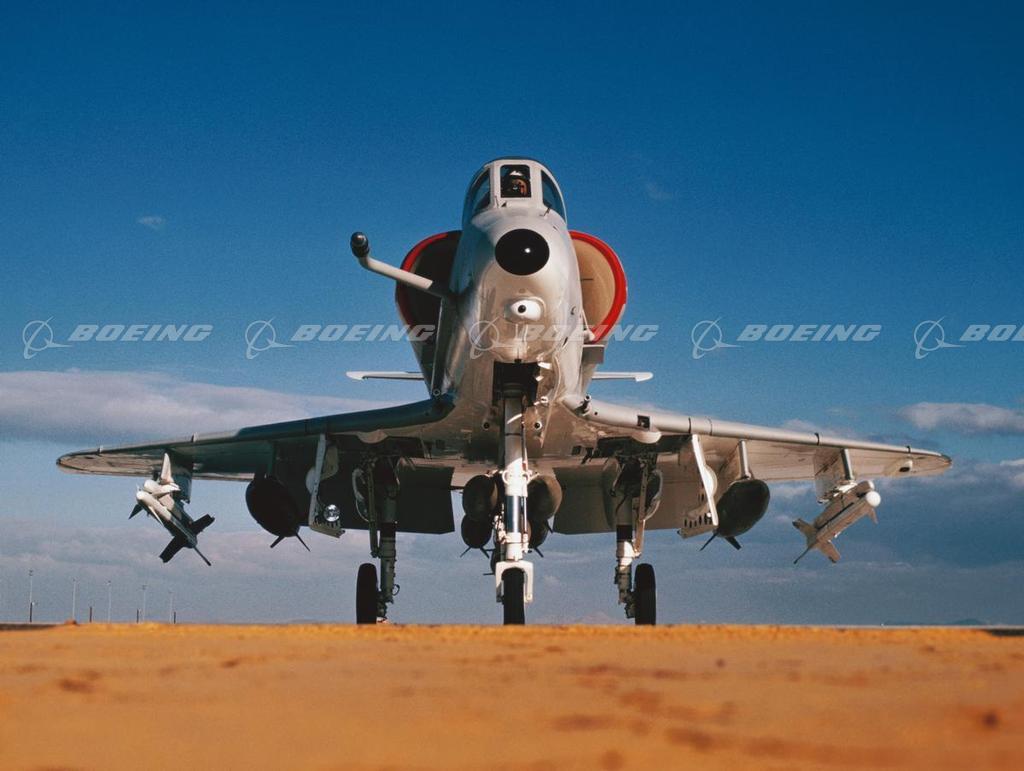 Douglas A-4 Skyhawk (1954-1979): Another successful attack aircraft from the Ed Heinemann team at Douglas was the A-4 Skyhawk. Designed for carrier operations, the Skyhawk was America’s smallest combat jet. Known as “Heinemann’s Hot Rod,” “Scooter,” and the “Mighty Midget,” it reversed the trend toward bigger and more complex aircraft in favor of durability and reliability. The A-4D first flew on June 22, 1954, demonstrating combinations of high performance and lightweight, with speed and maneuverability never before seen in an attack jet. After 1962, the joint service designation was changed to A-4. Behind the AD Skyraider, the A-4 Skyhawk was the most numerous postwar combat aircraft built by Douglas. During its long service career, the U.S. Navy and Marine Corps and the air arms of six other nations flew the A-4 The Skyhawk saw combat in Vietnam, the Middle East, the Falkland Islands, and the Persian Gulf. For 12 years, from 1974 to 1986, the A-4 Skyhawk served with the Navy’s Blue Angels flight demonstration team. In 1979, twenty-five years after its first flight, the last of 2,960 A-4s was delivered. Two-seat trainer versions included the TA-4F, TA-4J and the TA-4K Series. In addition to its primary role as a jet trainer, the TA-4 retained the A-4’s combat capabilities with bombs, rockets, missiles and guns. The TA-4 series had a slightly longer fuselage but carried less internal fuel than the A-4 attack bomber series. The first of the A-4 jet trainer series was delivered to the U.S. Navy in February 1966. A total of 555 TA-4 jet trainers were built. An additional 23 TA-4s were modified from A-4 airframes.