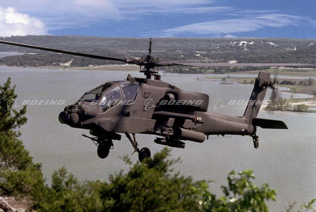 A U.S. Army AH-64A Apache surveys surrounding terrain behind the cover of trees during training exercises at Fort Hood, Texas.