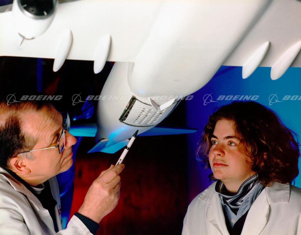 Victor Buonadonna, senior systems engineer, left, and Dea Good, systems engineer, examine exhaust ports on the underside of a 747-400F freighter model that recently underwent wind tunnel tests at Boeing in Seattle. The testing was part of the U.S. Air Force Airborne Laser (ABL) program. The ABL is being designed and developed by a Boeing-TRW-Lockheed Martin team. When completed, the ABL would mount a chemical laser aboard a modified 747-400F that would be capable of destroying Scud-type missiles during their early boost phase. Air Force Airborne Laser (ABL) program