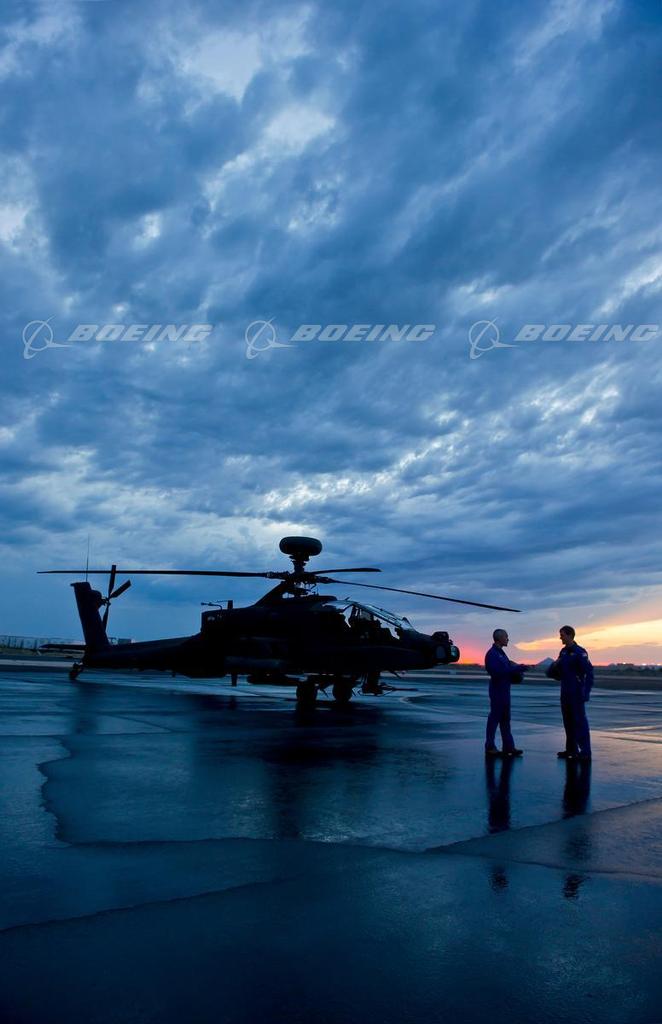 Boeing Test & Evaluation pilots Dave Guthrie, left, and Dave Bauer enjoy a moment on the Mesa, Arizona flight line at sunset before taking a Block III Apache attack helicopter for a test flight. 2011