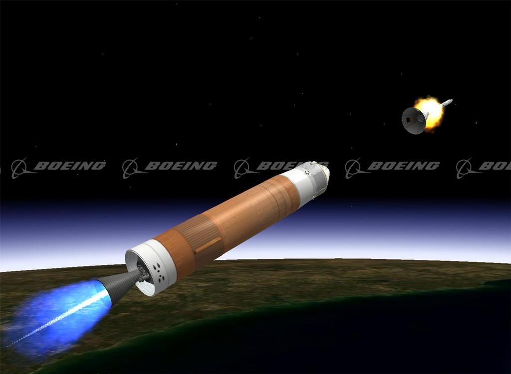 The escape tower is shown here being jettisoned from the Ares I upper stage in this artists conception. Boeing is competing to produce the upper stage for the Ares I crew launch vehicle, NASAs first new human-rated launch vehicle since the space shuttle. The 309-foot long, two-stage Ares I rocket is capable of launching approximately 25 metric tons into low Earth orbit. The Ares I rocket is slated for its first flight in 2009.