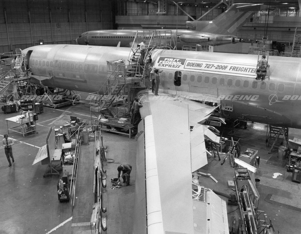The 727-200, introduced in December 1967, had increased gross weight and a 20-foot longer fuselage that could accommodate as many as 189 passengers in an all-tourist configuration. In all its variations, 1,245 of the -200s were sold. The last version, the 727-200F, was introduced in September 1981 and had a 58,000-pound, 11-pallet cargo capability. Fifteen of these were sold to Federal Express. Production of the 727 extended from the early 1960s to August 1984 -- a remarkable length of time, considering the original market forecast was for 250 airplanes. As it turned out, 1,831 were delivered. Twenty years later, when the last 727 was delivered, this versatile fleet was carrying 13 million passengers each month.