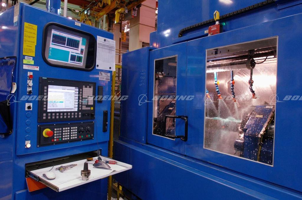 Automated numerically-controlled machines are used to drill and form cured composite parts at the Boeing composites manufacturing facility in Frederickson, Washington.