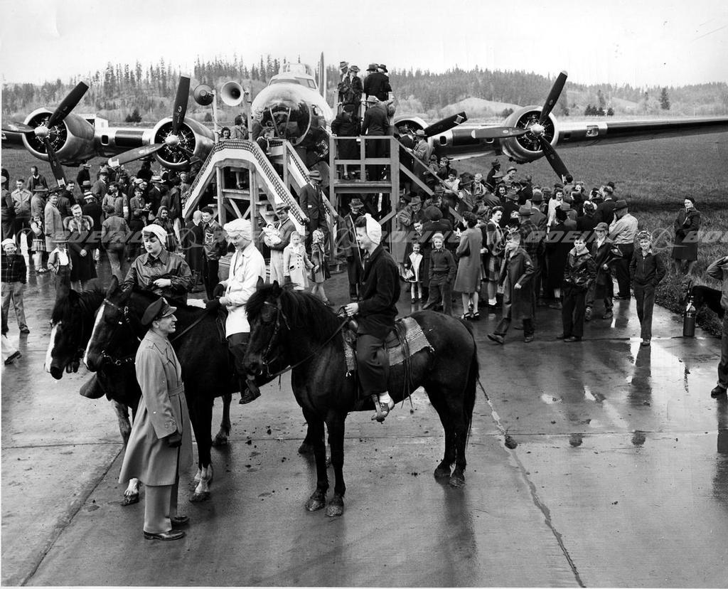 The B-17 was doing a tour of all of the Boeing branch plants in Washington State and this particular photo shows employees from the Chehalis branch plant riding out (in car and on horseback) to have a look at the finished product that they helped build.