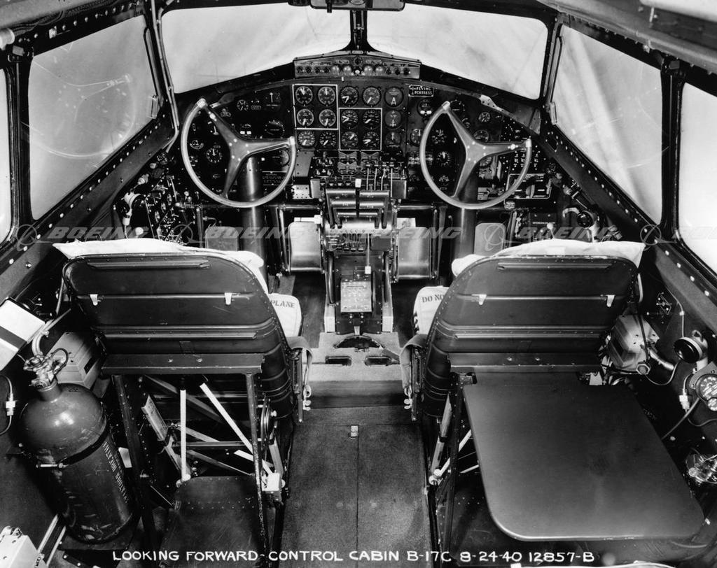 The B-17 was a low-wing monoplane that combined aerodynamic features of the XB-15 giant bomber, still in the design stage, and the Model 247 transport. The B-17 was the first Boeing military aircraft with a flight deck instead of an open cockpit and was armed with bombs and five .30-caliber machine guns mounted in clear "blisters." The B-17E, the first mass-produced model Flying Fortress, carried nine machine guns and a 4,000-pound bomb load. It was several tons heavier than the prototypes and bristled with armament. It was the first Boeing airplane with the distinctive -- and enormous -- tail for improved control and stability during high-altitude bombing. Each version was more heavily armed.